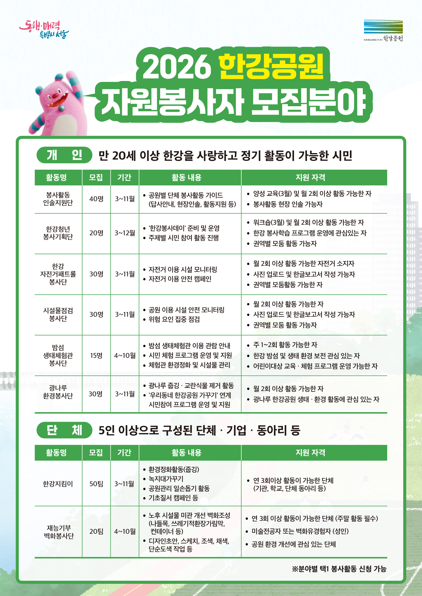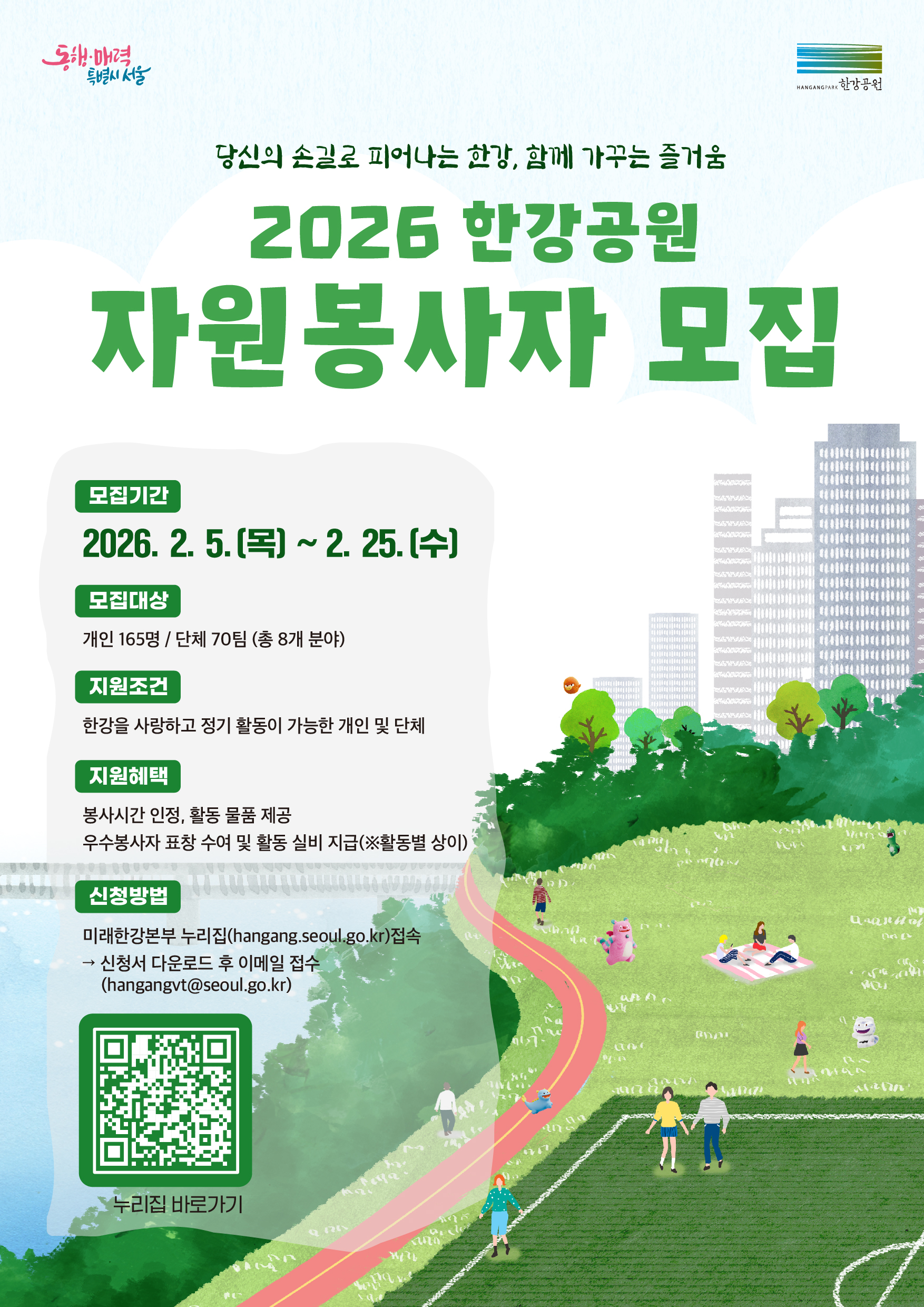 [모집완료] 2026년도 한강공원 자원봉사자 및 단체 모집 ('26.2.5.~2.25.)