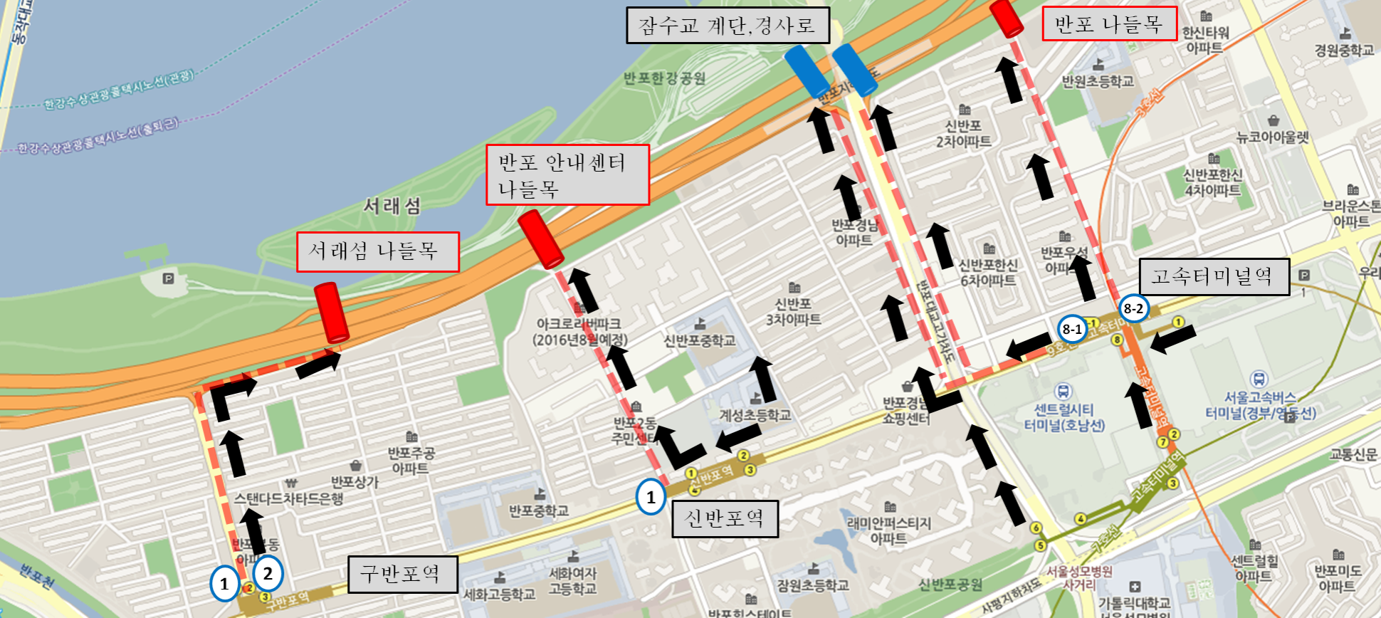 - 고속터미널역 6번, 8-1번출구 방향에서 오실 때 : 잠수교 계단, 경사로 이용