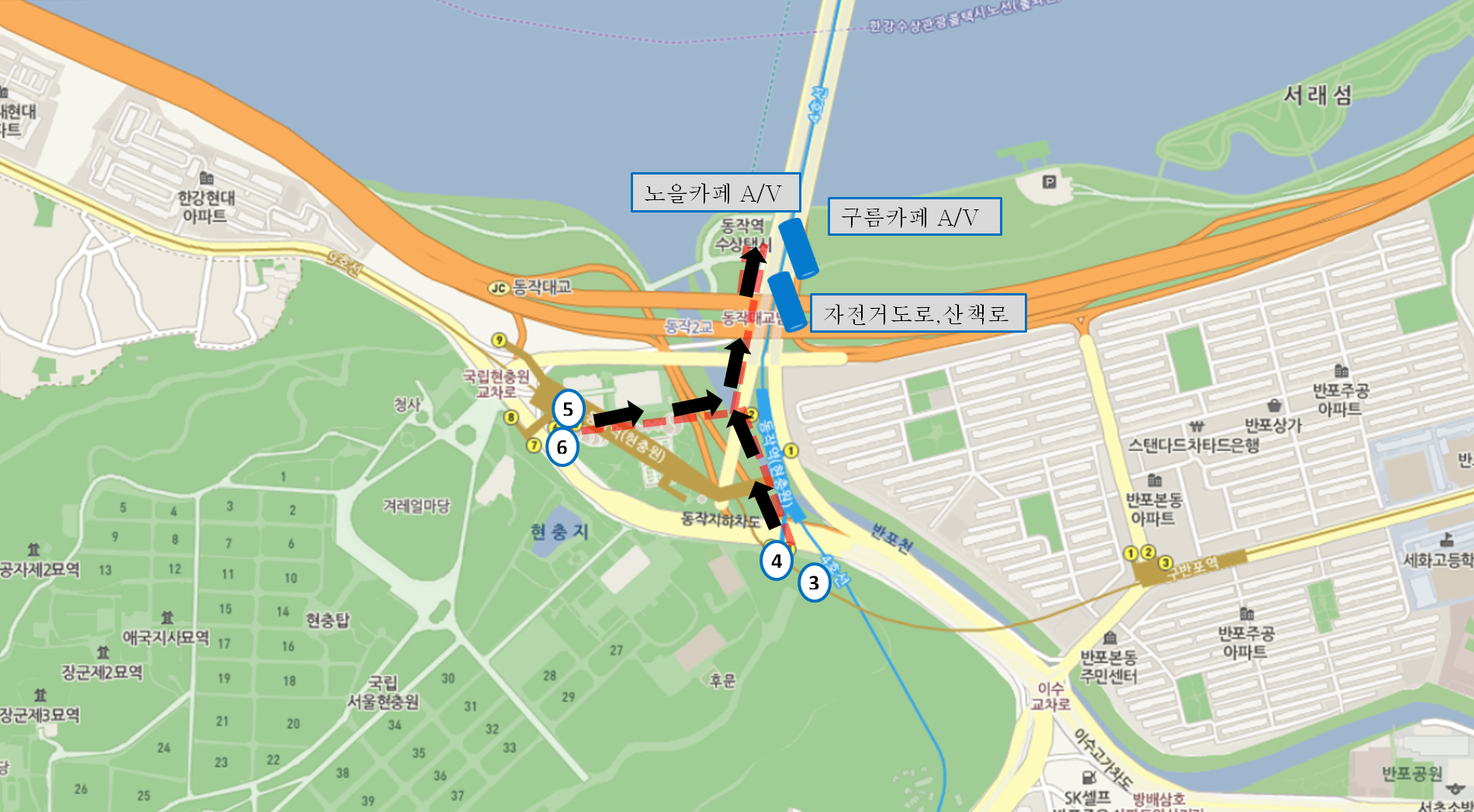 - 동작역 3번, 4번, 5번, 6번출구 방향에서 오실 때 : 자전거도로, 산책로 이용