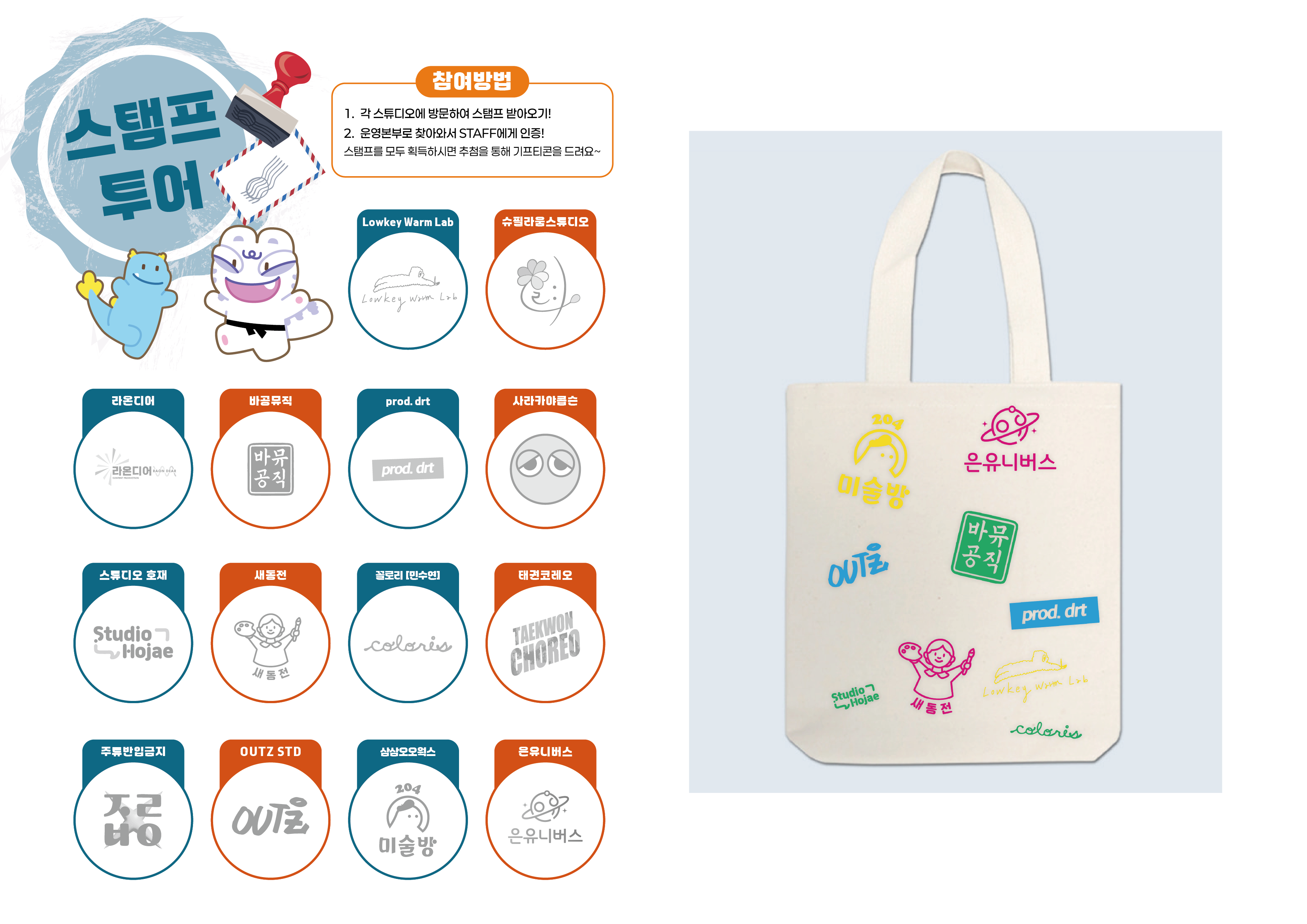 • 모든 스튜디오를(14개) 방문해 스탬프를 전부 모으면 ‘실크스크린 에코백 제작 체험’ 참여 기회를 제공해요