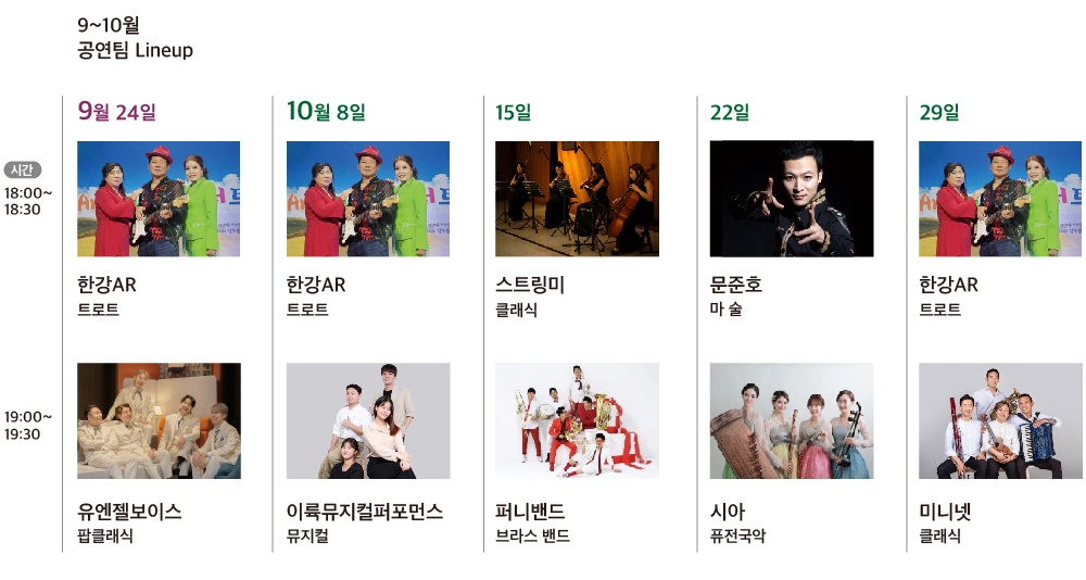 - 공연장르 : 클래식, 팝페라, 재즈, 브라스, 국악, 뮤지컬, 마술 등